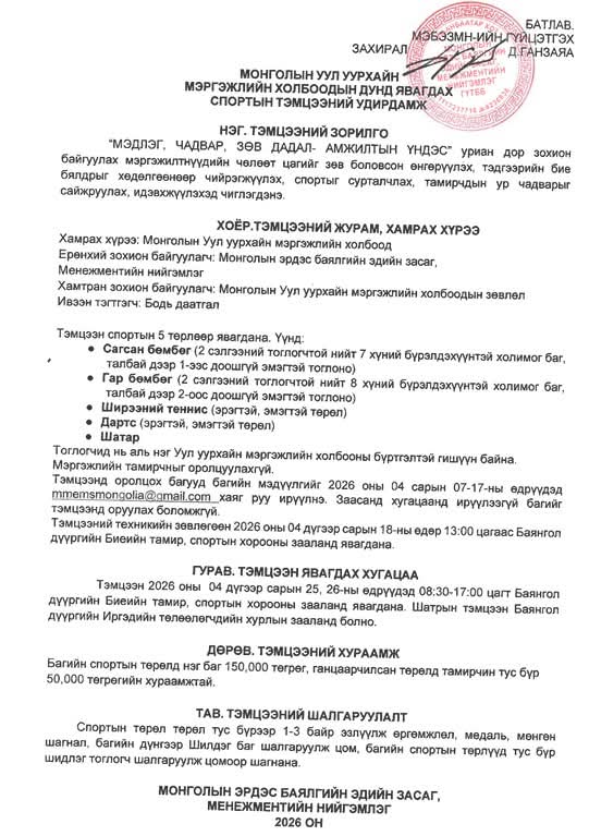 Монголын уул уурхайн салбарын мэргэжилтнүүдийг нэгтгэн, хамтын ажиллагаа, нөхөрсөг уур амьсгалыг бүрдүүлэх зорилготой спортын тэмцээн зохион байгуулагдах гэж байна. Энэхүү тэмцээн нь зөвхөн өрсөлдөөнөөс гадна оролцогчдын эрүүл мэндийг дэмжих, чөлөөт цагийг зөв боловсон өнгөрүүлэх, бие бялдрын хөгжил, ур чадварыг сайжруулахад чиглэсэн онцлогтой. Тэмцээний хүрээнд сагсан бөмбөг, гар бөмбөг, ширээний теннис, дартс, шатар зэрэг олон төрлөөр баг болон ганцаарчилсан өрсөлдөөн явагдана. Салбар бүрийн төлөөлөл болсон оролцогчид өөрсдийн ур чадвар, авхаалж самбаа, багийн ажиллагааг сорин өрсөлдөж, шилдгүүдээ тодруулах юм. Иймд МОНГОЛЫН АШИГТ МАЛТМАЛ БАЯЖУУЛАГЧДЫН ХОЛБООНЫ гишүүд та бүхэн маань тэмцээнд баг бүрэлдүүлэн идэвхитэй оролцохыг хүсье.